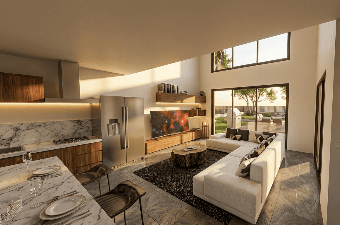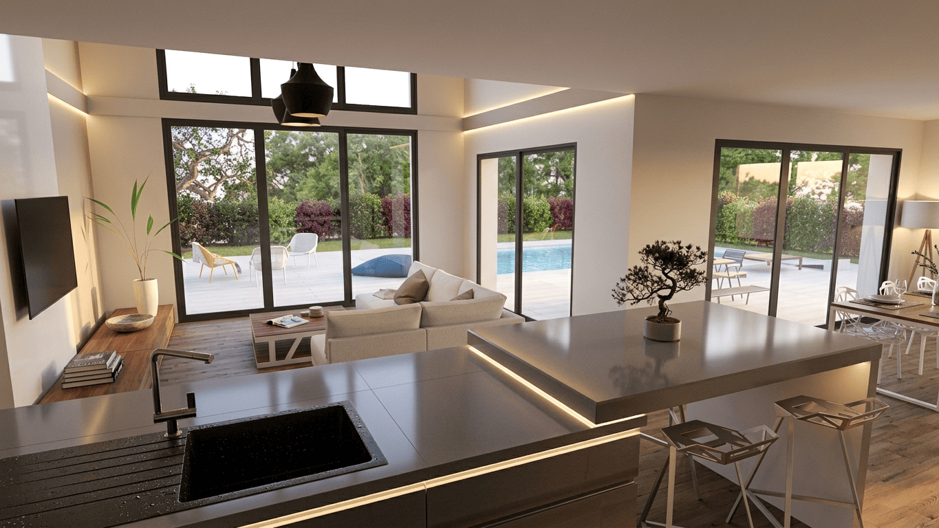 IBIZA présente une architecture extrêmement contemporaine d’une luminosité sans égal, avec une belle hauteur sous plafond. Son séjour de 62 m² vous permet d’accéder directement à un porche couvert de 15m