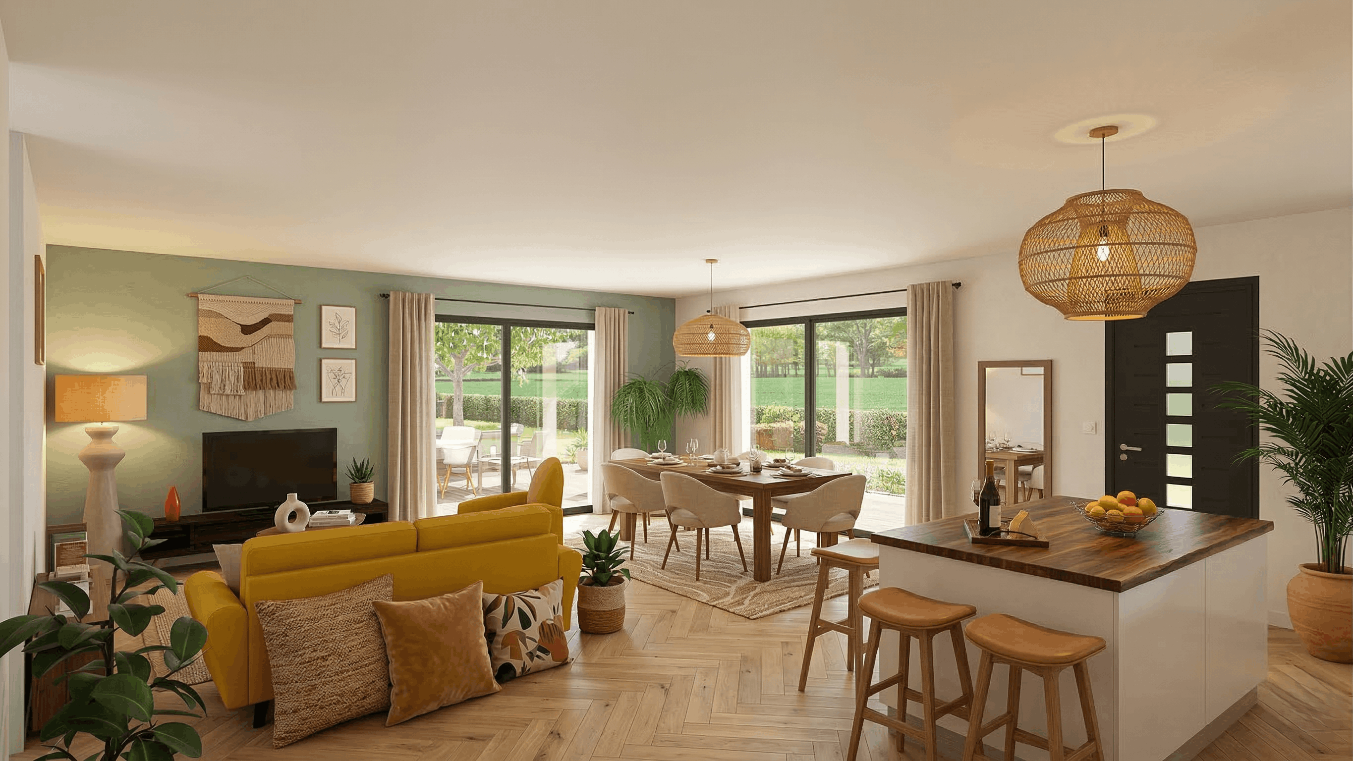 Une maison de plain-pied avec 3 chambres, séjour ouvert et garage intégré