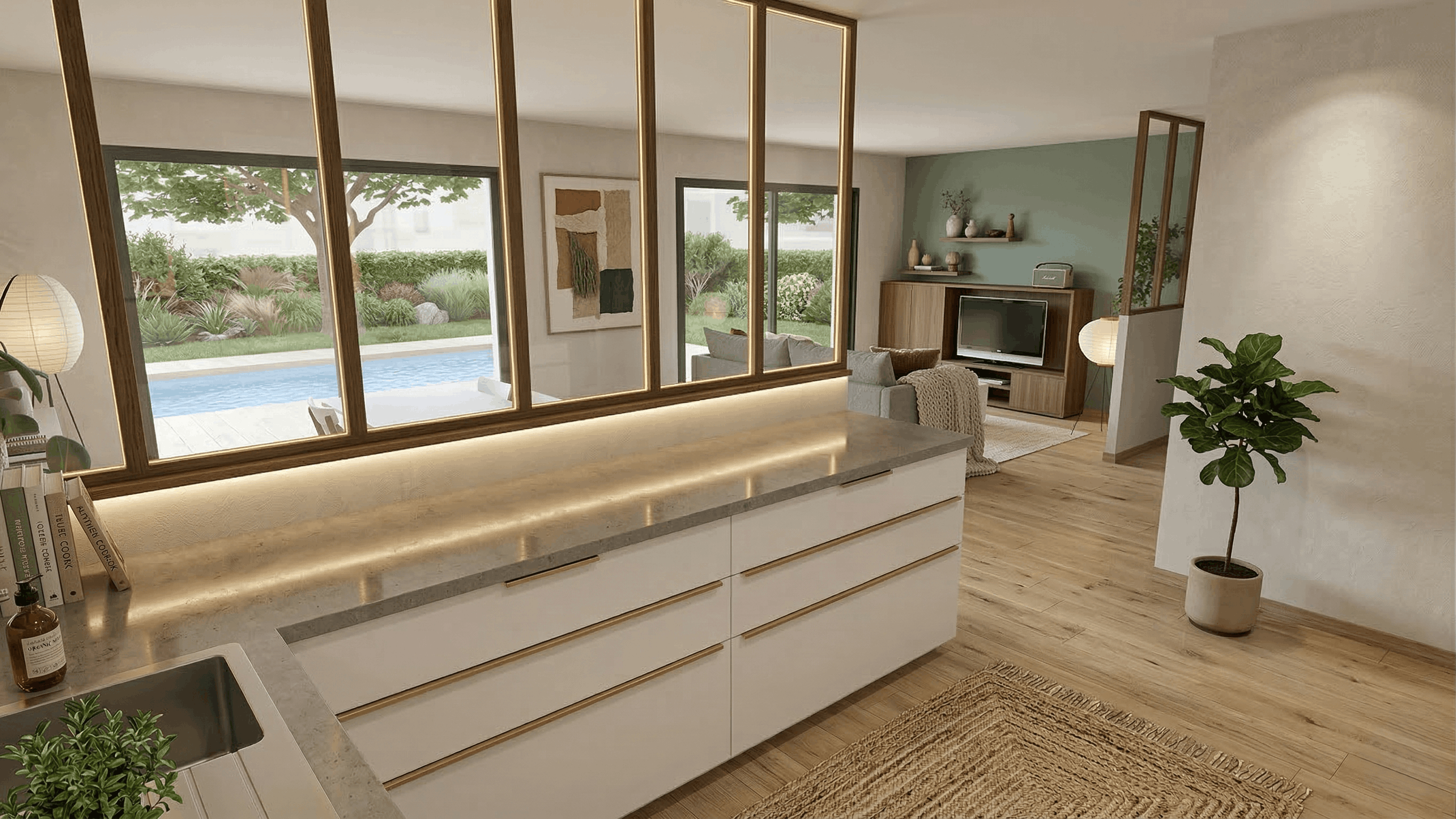 Dans votre maison Pop!, les mètres carrés sont optimisés. Son concept vous laisse la possibilité d’aménager l’espace intérieur selon vos besoins. Sous votre crayon, votre intérieur prend forme. Vous donnez une touche design à votre séjour en créant une séparation avec votre cuisine grâce à une verrière. Vous pouvez également aménager un espace de travail à domicile.