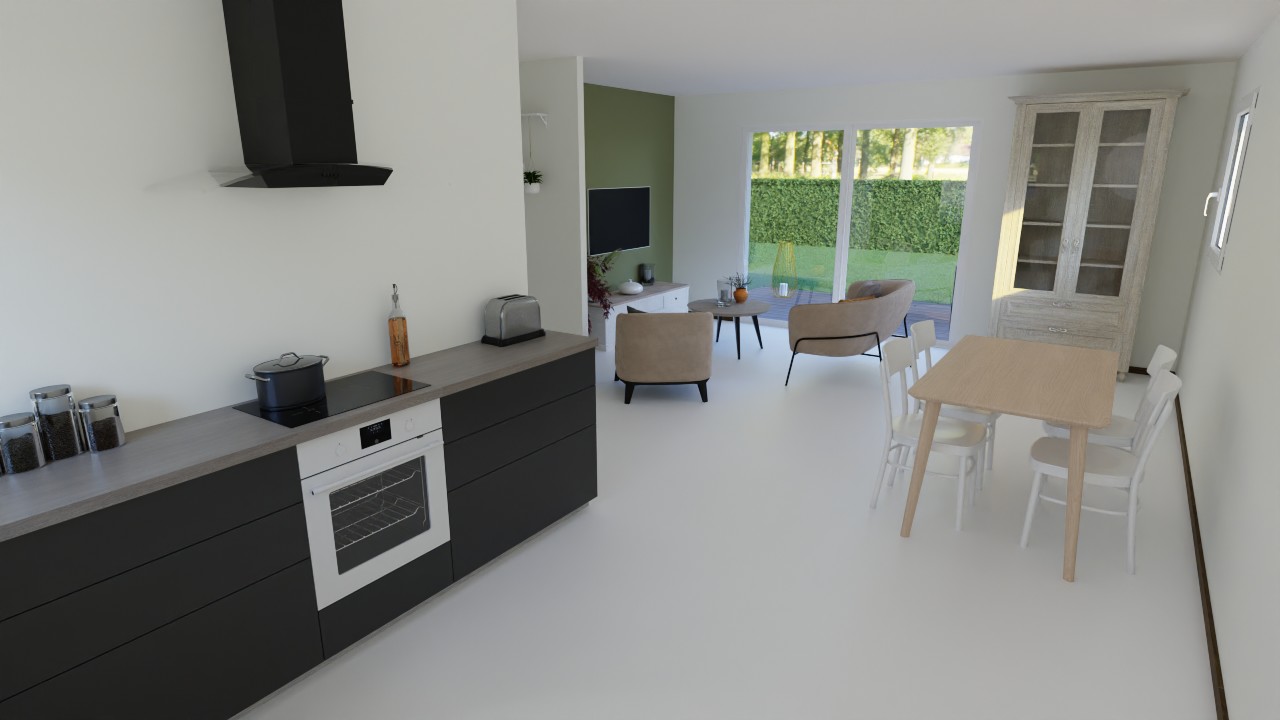 une pièce de vie de 34 m², 2 chambres, une salle d’eau, des WC indépendants (cellier et/ou garage en option).