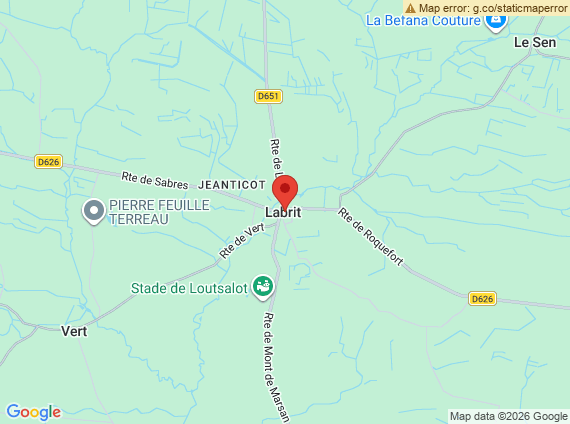 Située à environ 30 minutes de Mont-de-Marsan et proche des principaux axes routiers, Labrit permet de profiter d’un cadre de vie naturel tout en restant facilement accessible.